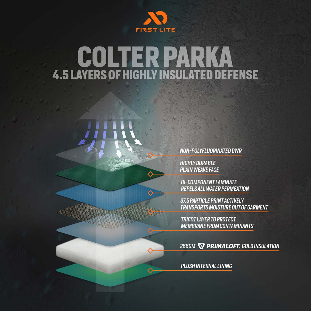 Built with the outfitter in mind, the Colter Parka is the jacket that can handle 100+ day seasons without fail. Generous Primaloft® Gold insulation keeps you extremely warm and comfortable, while our proprietary 4.5 Layer Laminate Package repels all water and wind and remains extremely durable. Whether you are in the saddle, side-by-side, opening sheep camp, or glassing for that once-in-a-lifetime tag, the Colter can be relied on all the way in, and all the way back out, no matter how many days your season runs.